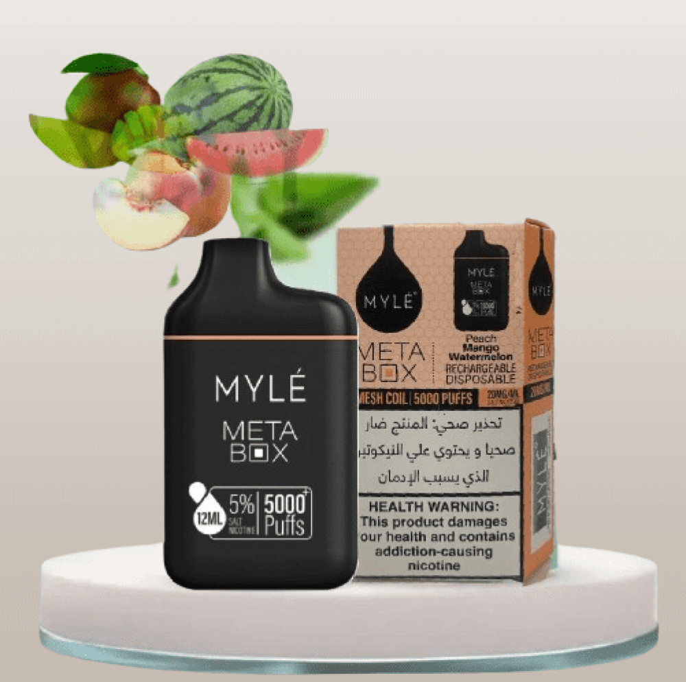 سحبة مايلي 5000 موشة بطعم خوخ مانجو وبطيخ | MYLE 5000 PUFFS META BOX DISPOSABLE PEACH MANGO WATERMELON